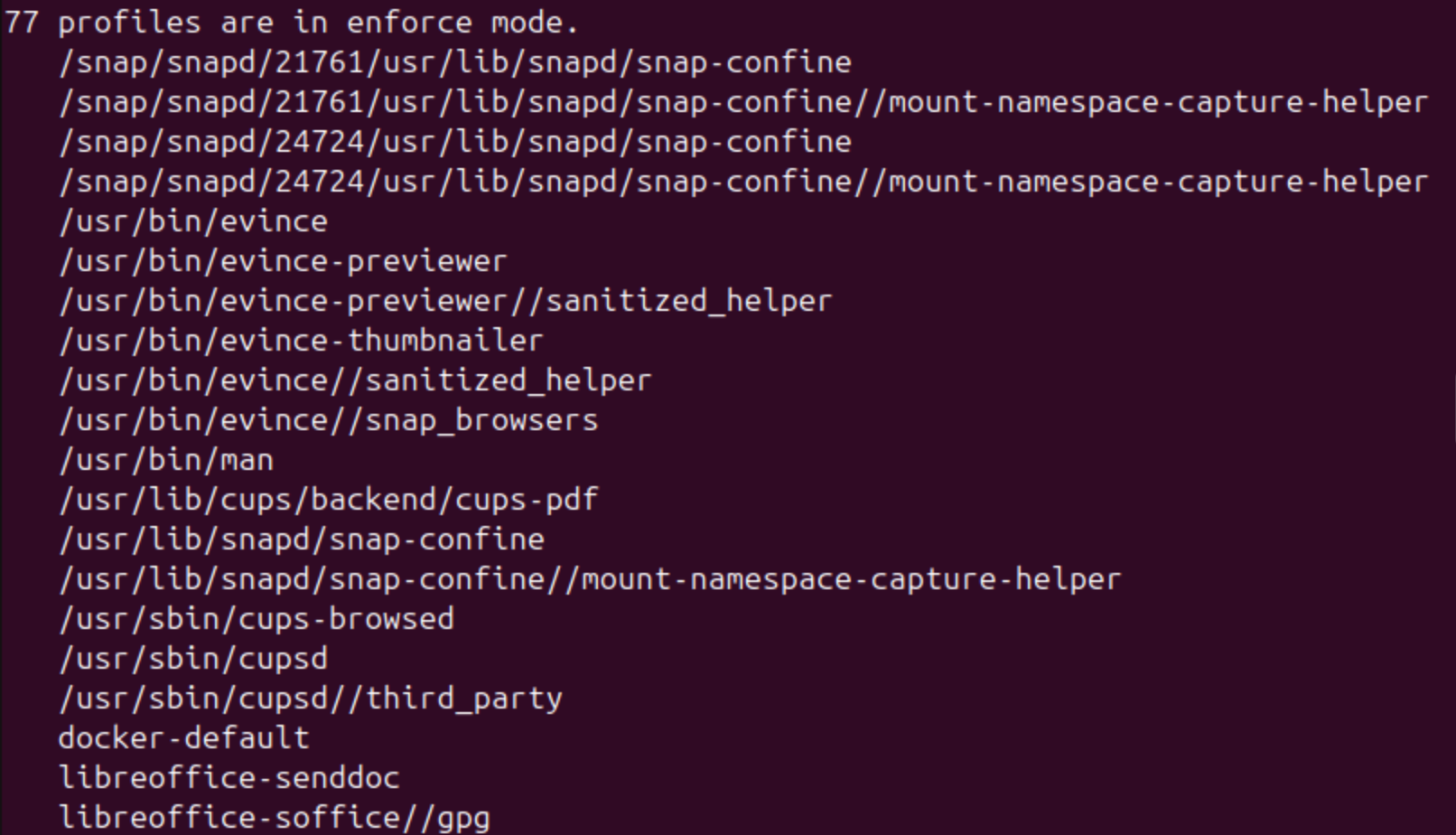 여기서 enforce 모드에 docker-default 프로파일이 등록되어 있는 것을 확인할 수 있다.