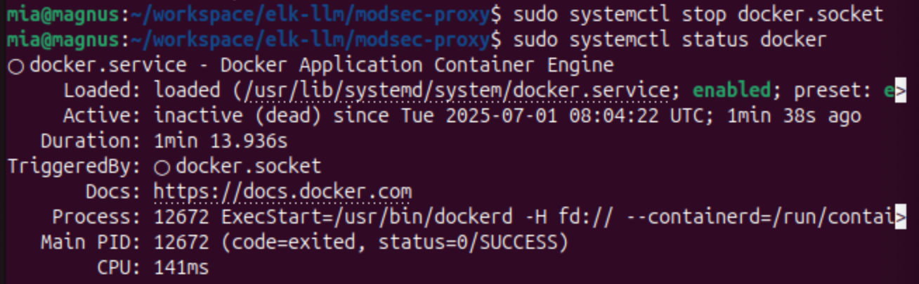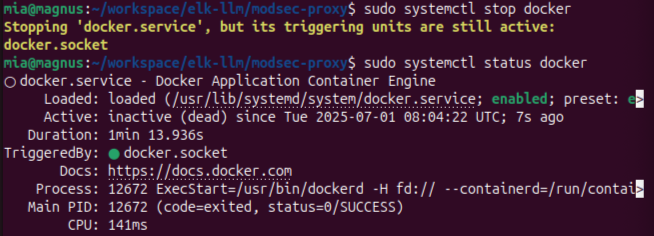 Docker 데몬에 중지 명령을 보내도 docker.socket이 아직 활성화되어 있다고 한다.