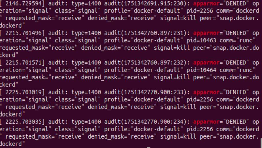 audit: type=1400 audit(...) apparmor="DENIED" operation="signal" class="signal" profile="docker-default" pid=2256 comm="dockerd" requested_mask="receive" denied_mask="receive" signal=kill peer="snap.docker.dockerd"