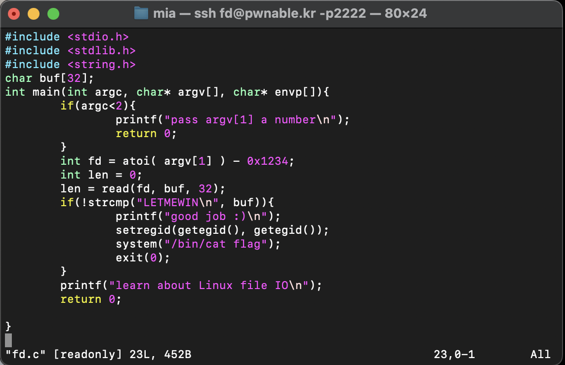 buf에 저장된 값이 LETMEWIN이면 fd_pwn 그룹의 권한으로 flag를 읽어준다.