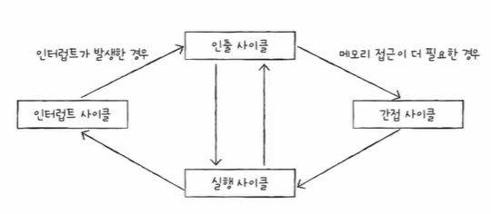 즉 어떤 명령어는 인출-실행 사이클만으로 실행되고, 어떤 명령어는 인출-간접-실행 사이클을 거쳐 실행된다.