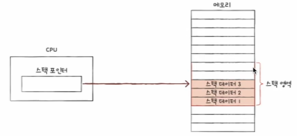 스택은 메모리의 스택 영역에 있고, CPU의 스택 포인터 레지스터가 스택의 꼭대기를 가리킨다.