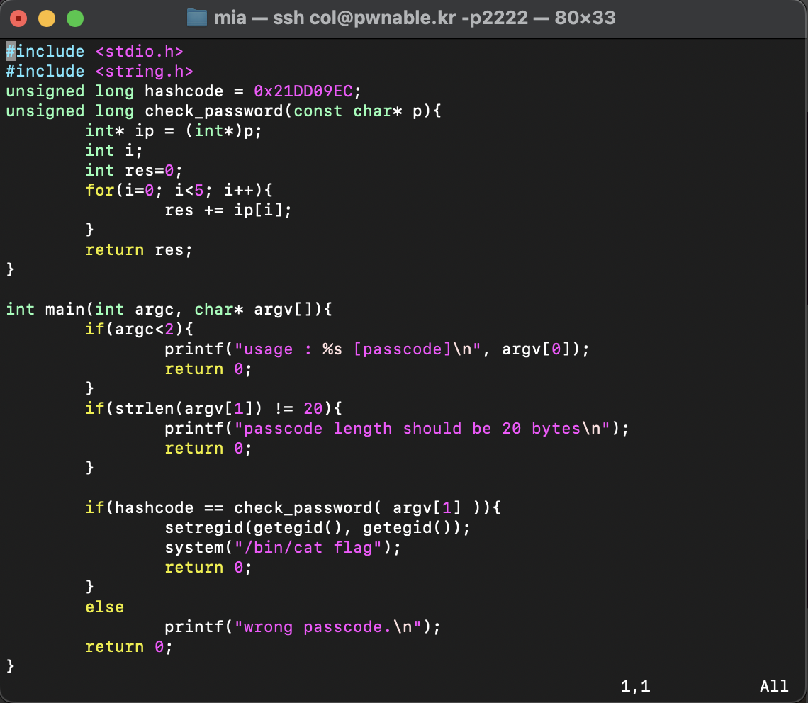 [Toddler's Bottle] collision3 pointsDaddy told me about cool MD5 hash collision today. I wanna do something like that too! MD5 해시 충돌에 관한 문제 col의 인자로 20바이트 크기의 패스코드를 받는데,패스코드를 인자로 준 check_password 함수의 리턴값과 해시코드 값이 같으면 flag를 실행시켜줌 해시코드 값 = 0x21DD09EC int는 4바이트이므로20바이트짜리 패스코드를 4로 나눔4바이트씩 5개 부분을 더한 값이 0x21DD09EC(=568134124)와 같아야 함 5부분으로 나눠보면:0x21DD09EC = 0x6C5CEC8 * 4 + 0x6C5CECC 0x6C5CEC8 -> \xC8..