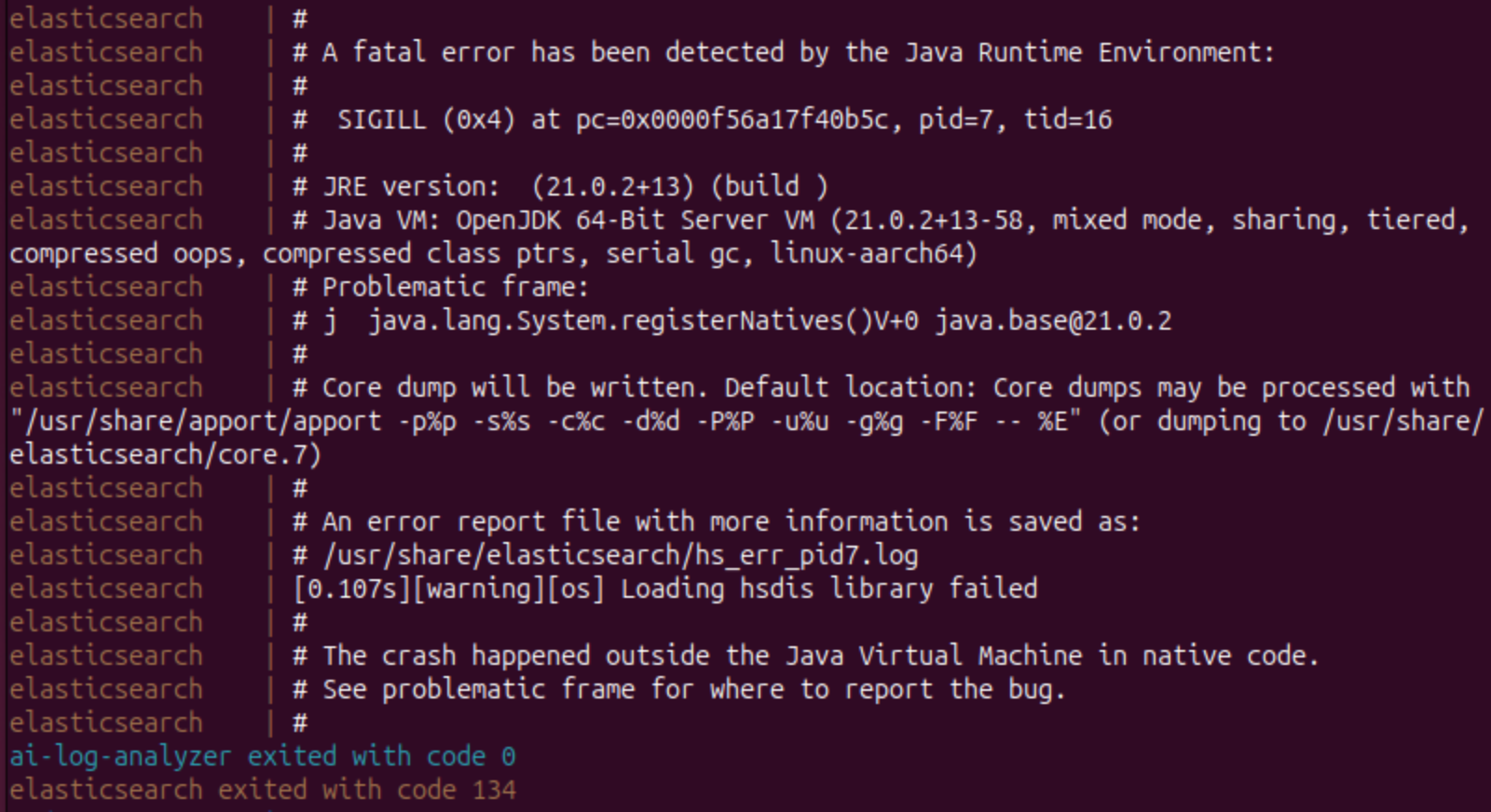 문제 에러 로그 전문:elasticsearch | #elasticsearch | # A fatal error has been detected by the Java Runtime Environment:elasticsearch | #elasticsearch | # SIGILL (0x4) at pc=0x0000f56a17f40b5c, pid=7, tid=16elasticsearch | #elasticsearch | # JRE version: (21.0.2+13) (build )elasticsearch | # Java VM: OpenJDK 64-Bit Server VM (21.0.2+13-58, mixed mode, sharing, tiered, compressed oo..